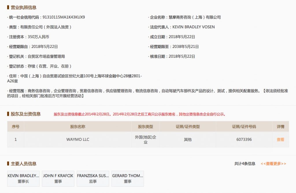 显现,一家名为“慧摩商务咨询(上海)有限公司”在本年 5 月注册建立,信息显现,该公司股东是 Google 母公司 Alphabet 旗下的自动驾驶公司 Waymo LLC。国家企业信息公示体系显现,慧摩商务咨询(上海)有限公司的主营规模包含“自动驾驶汽车部件及产品的规划、测验,供给相关配套服务”。