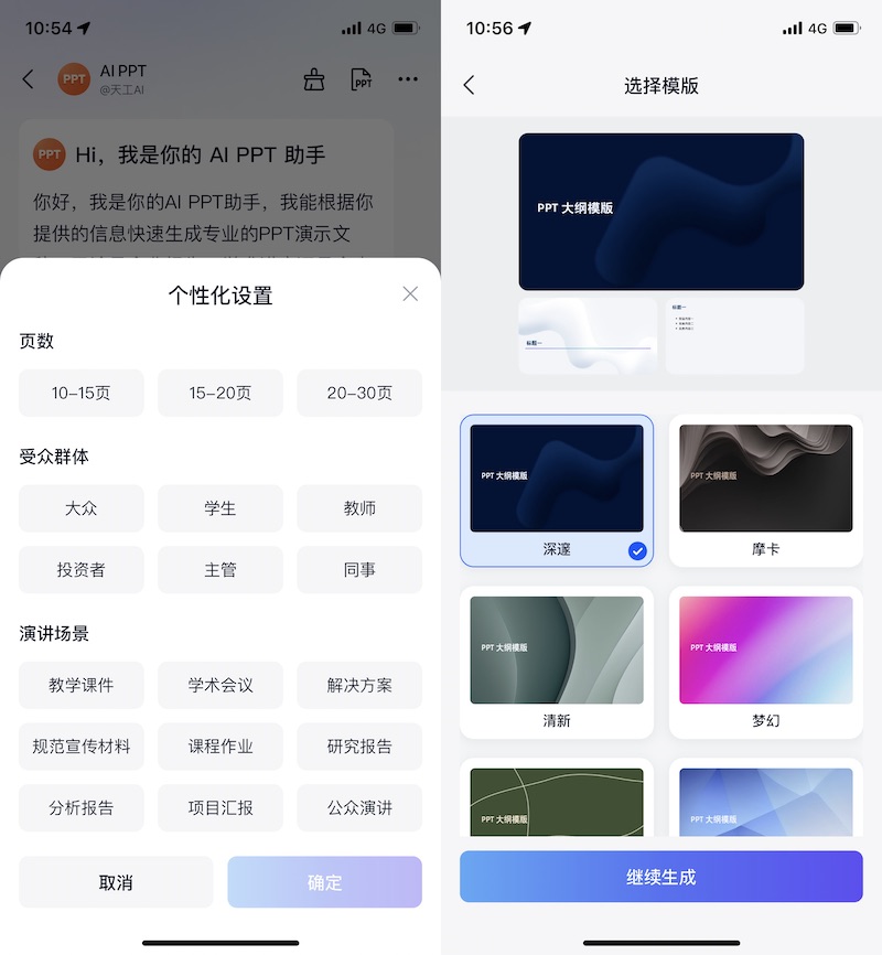 PPT 生成支撑个性化设置,能够设定页数、受众集体以及讲演场景;模版也有多种款式可选。不过这些精巧模版配不上天工 AI 的了解才能,惋惜了。