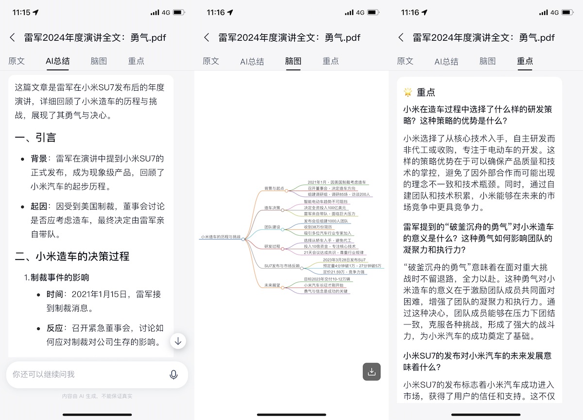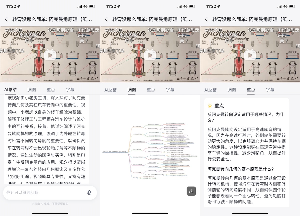天工的文档剖析首要支撑长文、音视频与网页链接方式,其间视频还支撑直接剖析哔哩哔哩视频。测验下来其文档剖析才能在所有才能里算是出彩。除了 AI 剖析,你还能够挑选生成脑图、阅览要点,视频的话还能够阅览字幕,自行查缺补漏。