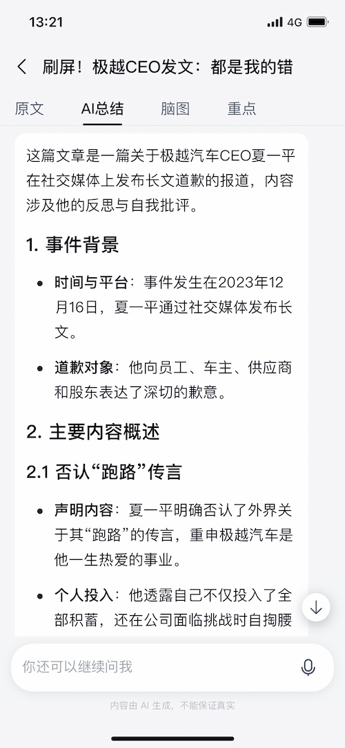 在 App Store 页面,官方说到天工是支撑“内容阅览”的 AI 帮手,但体会后咱们以为,一款以 AI 查找、AI 创造为卖点的产品,真的没有必要再放相似微博的内容聚合功用进去。就我个人感触来讲,这么做一方面会搅扰中心体会,另一方面不如把这些精力用在持续优化完善 AI 才能上。