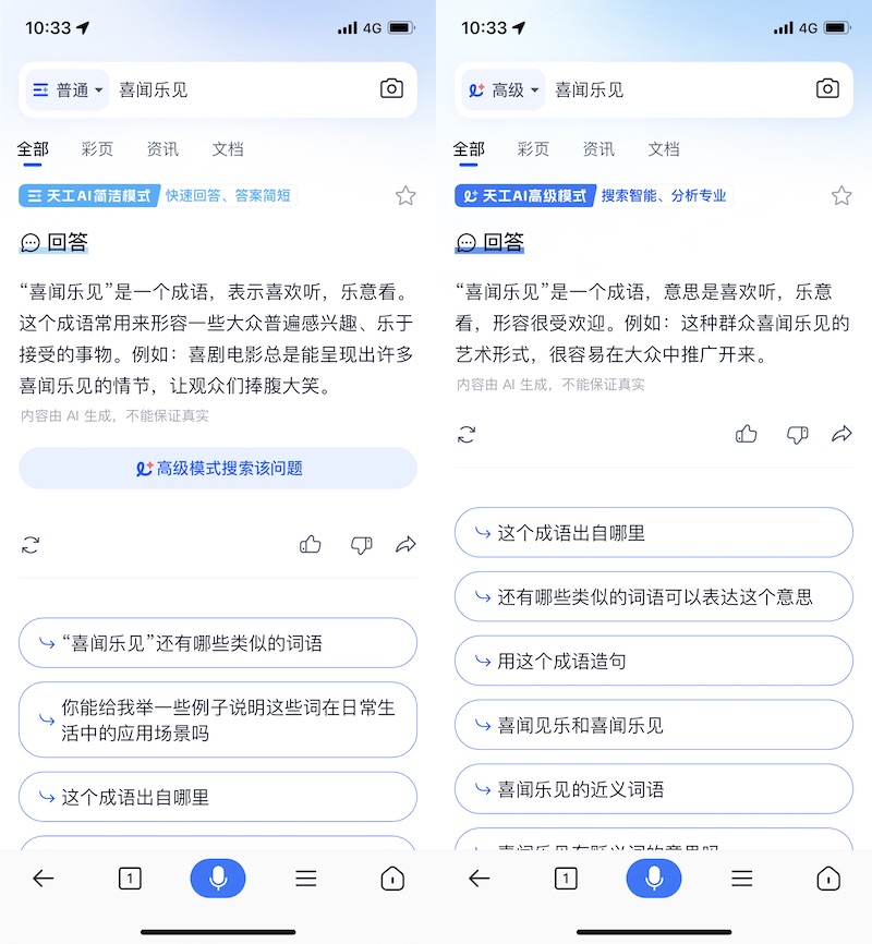不过有一点体会欠好——查找界面搅扰元素太多,包括点击查找栏弹出的热搜 / 猜你想问、上划后引证惯例的查找引擎效果、答复的挑选分类(悉数、资讯仍是文档)等。真话讲,用天工 AI 查找有一点用微博的感觉,资讯大爆炸,令人不悦。