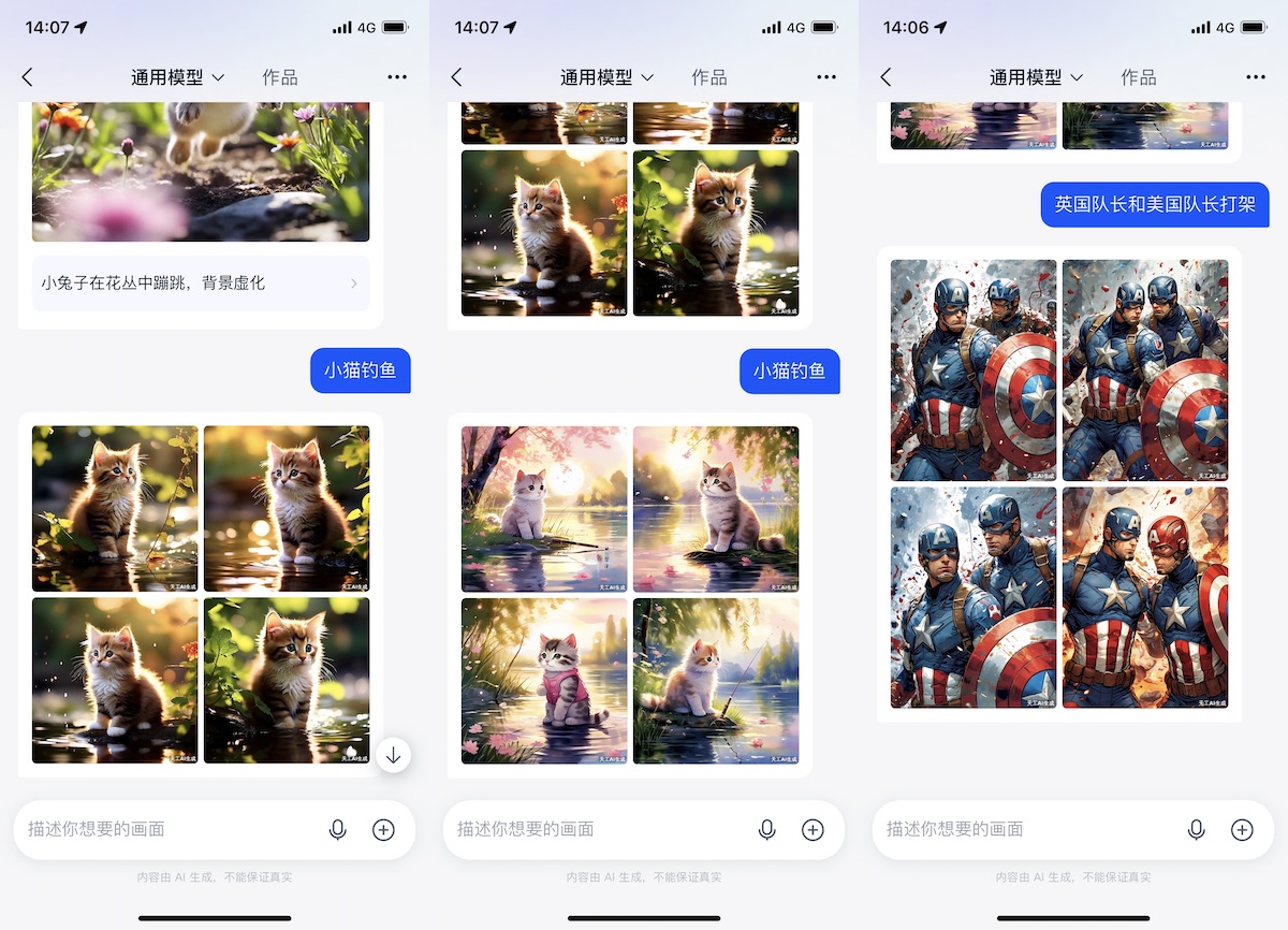 咱们首要挑选通用模型来生成“小猫垂钓”图片,效果第一轮四张图的四只小猫都没有在垂钓,从头生成的四张只要第一张和终究一张呈现了垂钓竿。