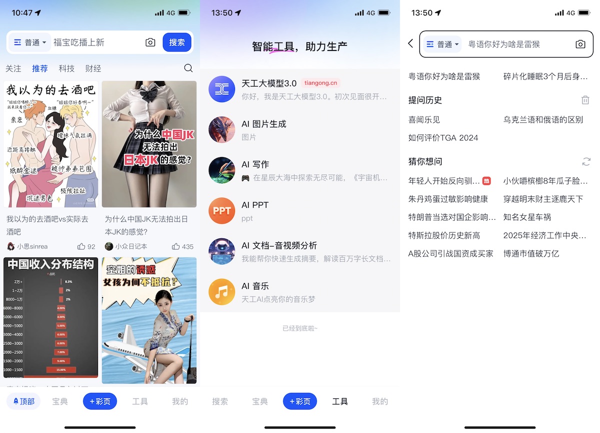 敞开天工 App 主界面,你会有种打开了抖音快手小红书的幻觉。它的主页夺目方位展现了许多招引眼球的内容卡片,实在是不堪入目,甚至有所谓擦边球内容。搅扰太多,我来这儿仅仅想查找答案,而不是杀碎片时刻。