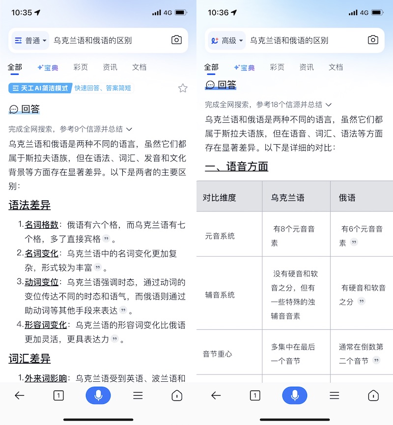 天工的 AI 查找在一般(简练)方式下响应速度还算不错,快速答复,但效果简略。高档方式会供给更多专业剖析,生成等待时刻相对长一些。如果是某某和某某差异之类的问题,高档方式下通常会给出比照表格,以供给直观效果。